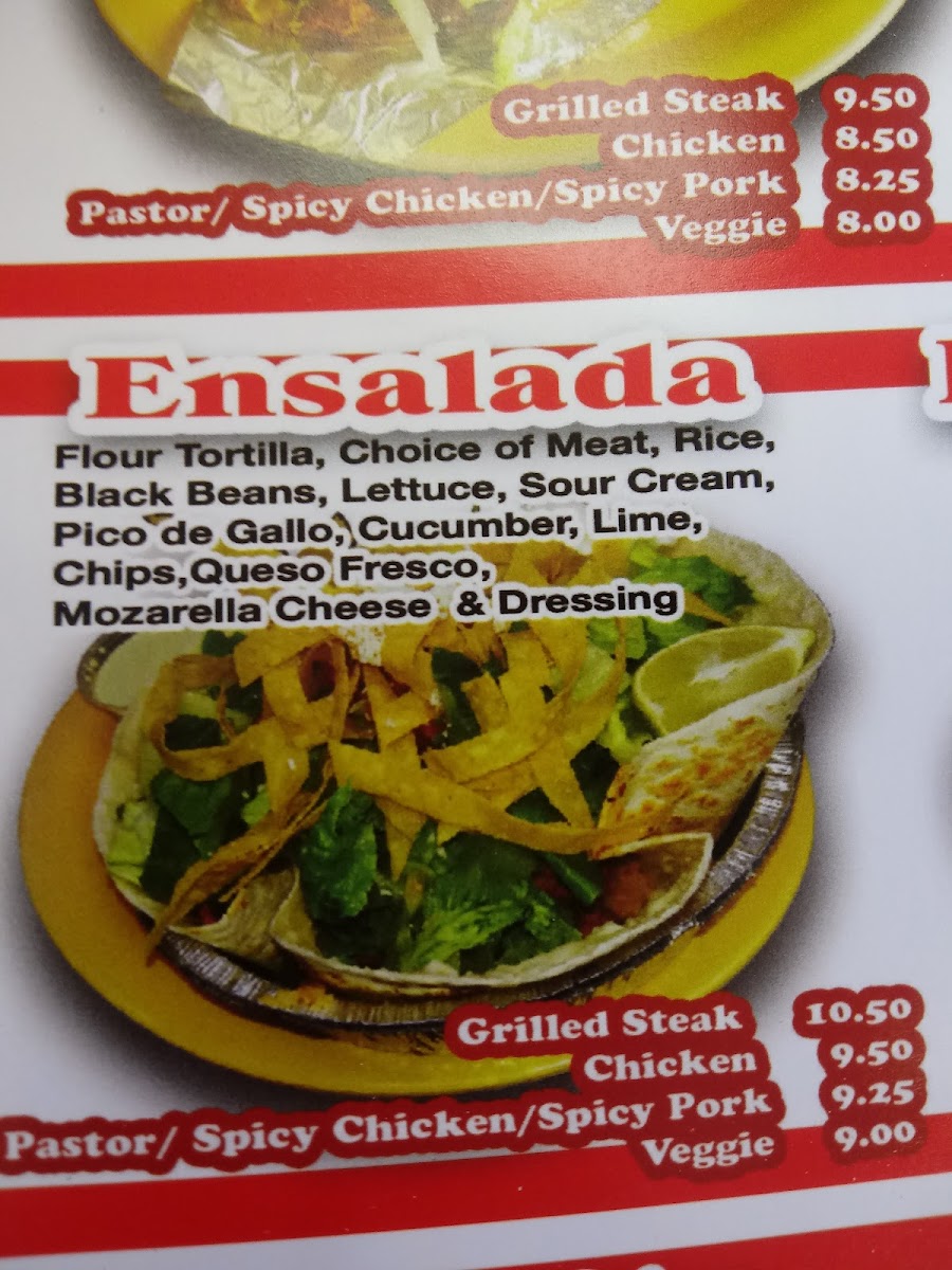 Flour tortilla, choice of meat, rice, black beans, lettuce, sour cream, pico de gallo, cucumber, lime, chips, queso fresco, mozzarella cheese and dressing.