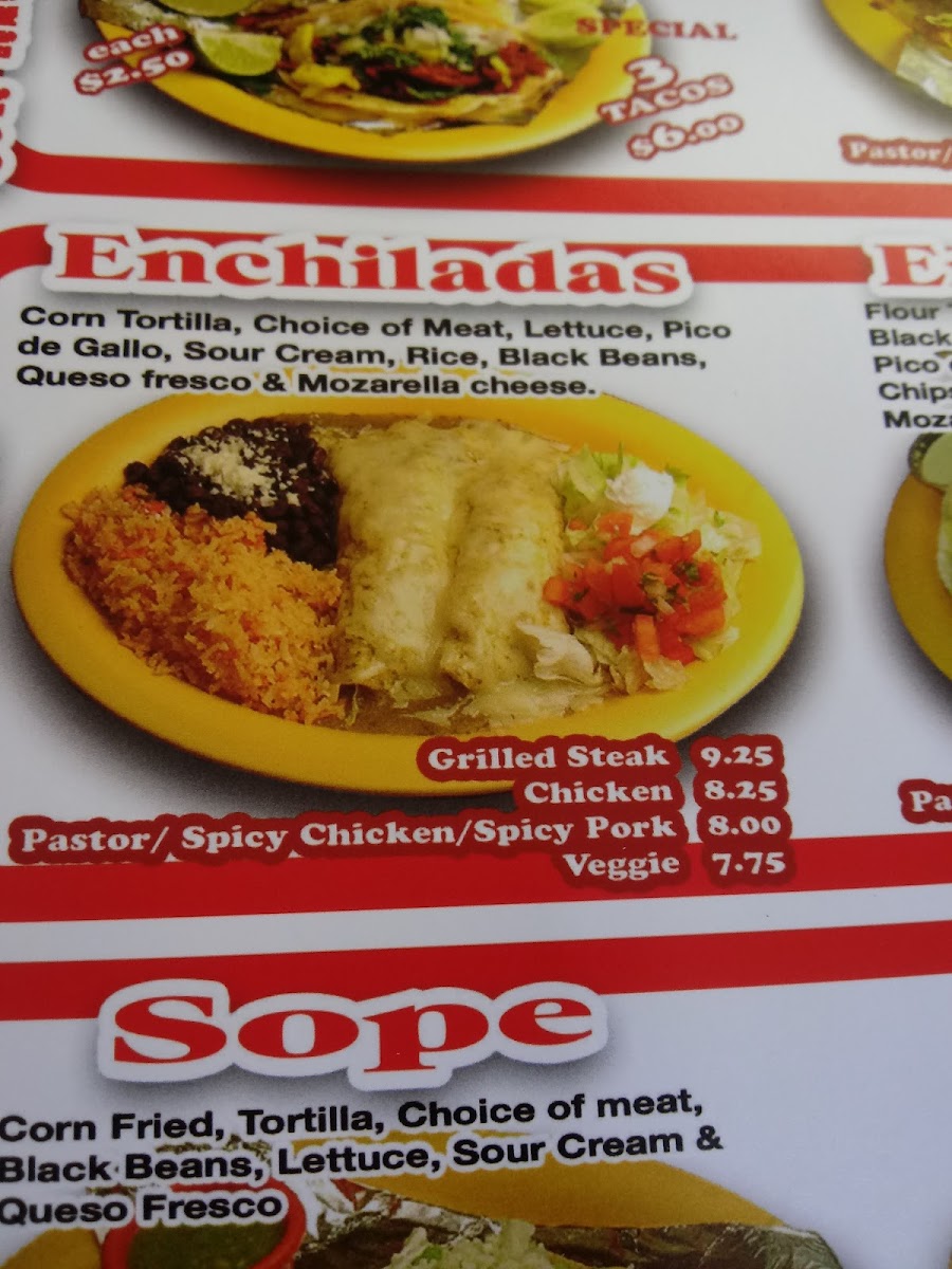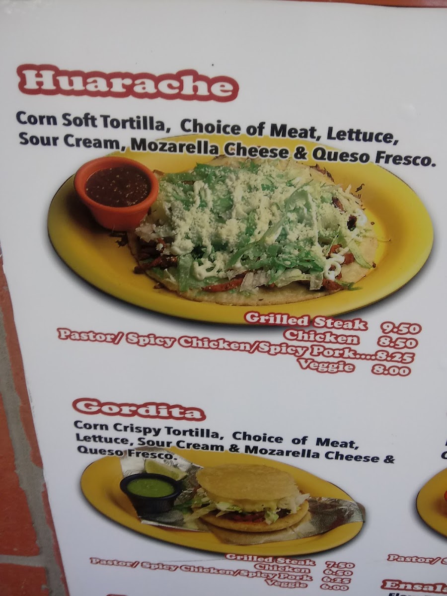 Corn soft tortilla, choice of meat, lettuce, sour cream, mozzarella cheese and queso fresco. Gluten free.