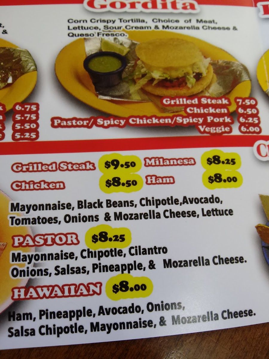 Mayonnaise ,chipotle sauce, cilantro, onions, salsas, pineapple and mozzarella cheese.