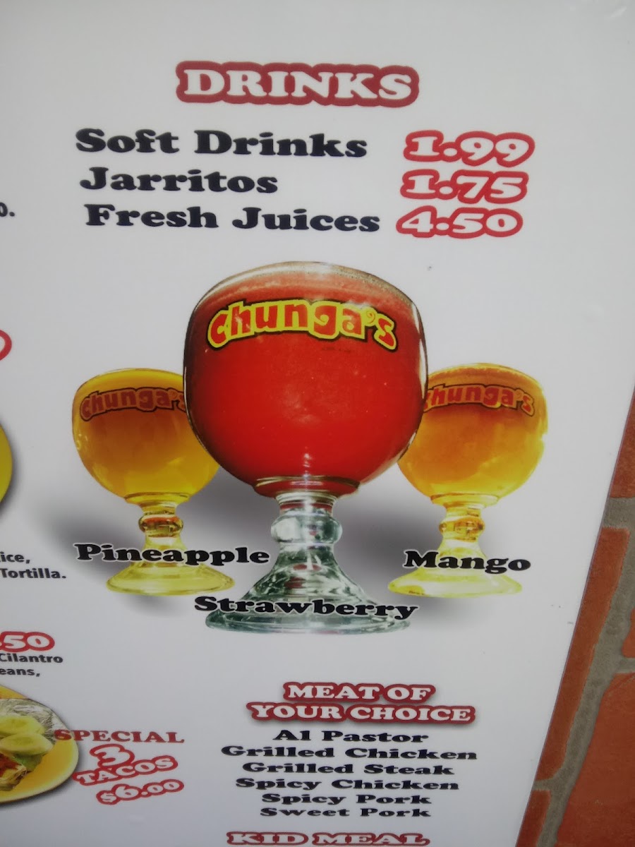 To quench your thirst, Chunga's serves Jarritos and fresh juices, providing a refreshing complement to the bold and spicy flavors of their dishes. For those with a sweet tooth, the dessert menu includes delicious choices like Frescas Con Crema, a sweet and creamy treat, and the Churro, crispy on the outside and soft on the inside, perfect for finishing your meal. The Platanos Con Lechera adds a delightful twist with its sweet plantains paired with rich, condensed milk.